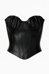 Our "Monroe" Corset top in black faux leather and our buttery stretch fabric "Capri" shorts in black.